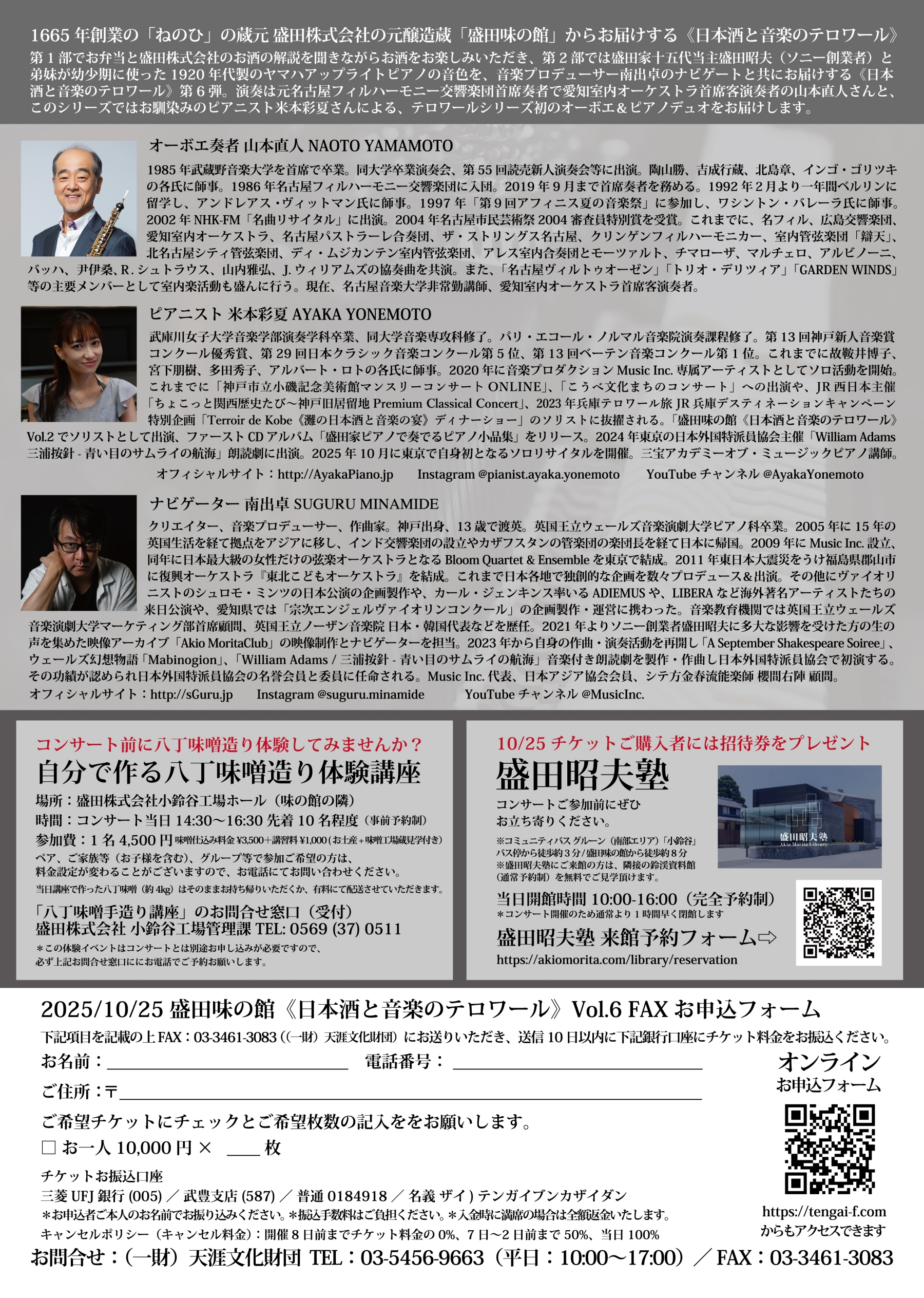 *参加費にお弁当、唎き酒、ソフトドリンク(お茶)、コンサート料金 & 盛田昭夫塾のご招待券が含まれています